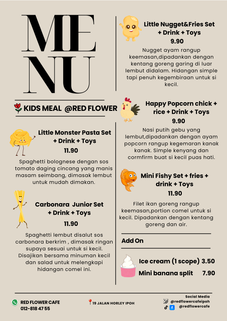 Welcome to RED FLOWER CAFE by KJMS Catering, a hidden gem located at 19, Jalan Horley, Kampung Jawa, Ipoh, Perak. This cozy cafe is not just about food; it’s about creating experiences. With its calming ambiance and unique, playful menu, it encourages you to embark on a delightful culinary adventure.
